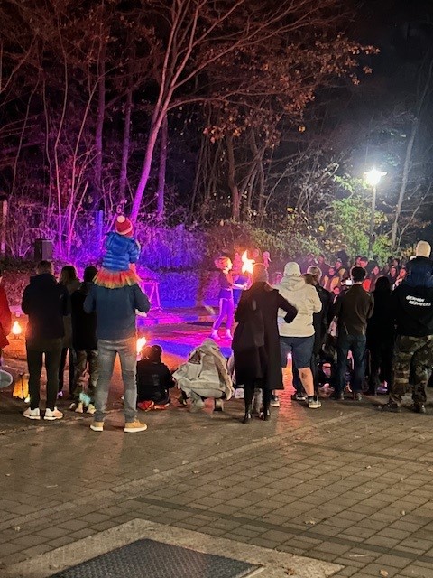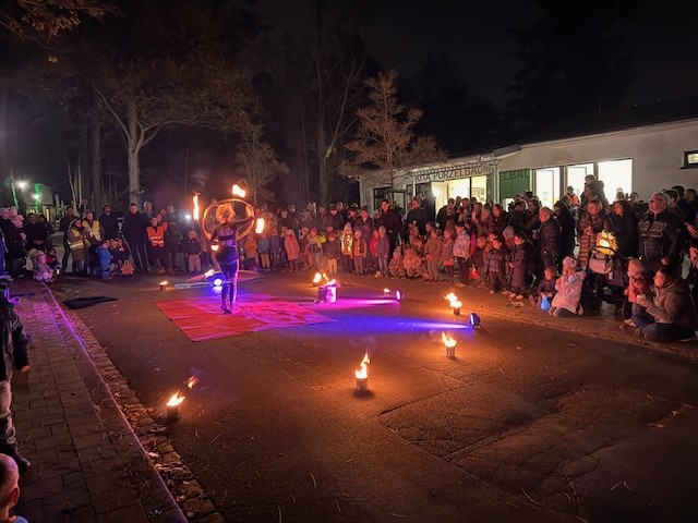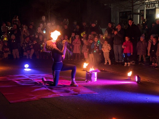 Nach der Rückkehr zur KiTa wartete eine eindrucksvolle Überraschung auf alle Teilnehmenden. Auf dem Parkplatz wurde eine Feuershow dargeboten, die sowohl Kinder als auch Erwachsene begeisterte. Für das leibliche Wohl sorgte der engagierte Elternbeirat. Die Einnahmen aus dem Verkauf von Punsch und Würstchen kommen zukünftigen Anschaffungen für die Krippen- und Kindergartenkinder zugute.