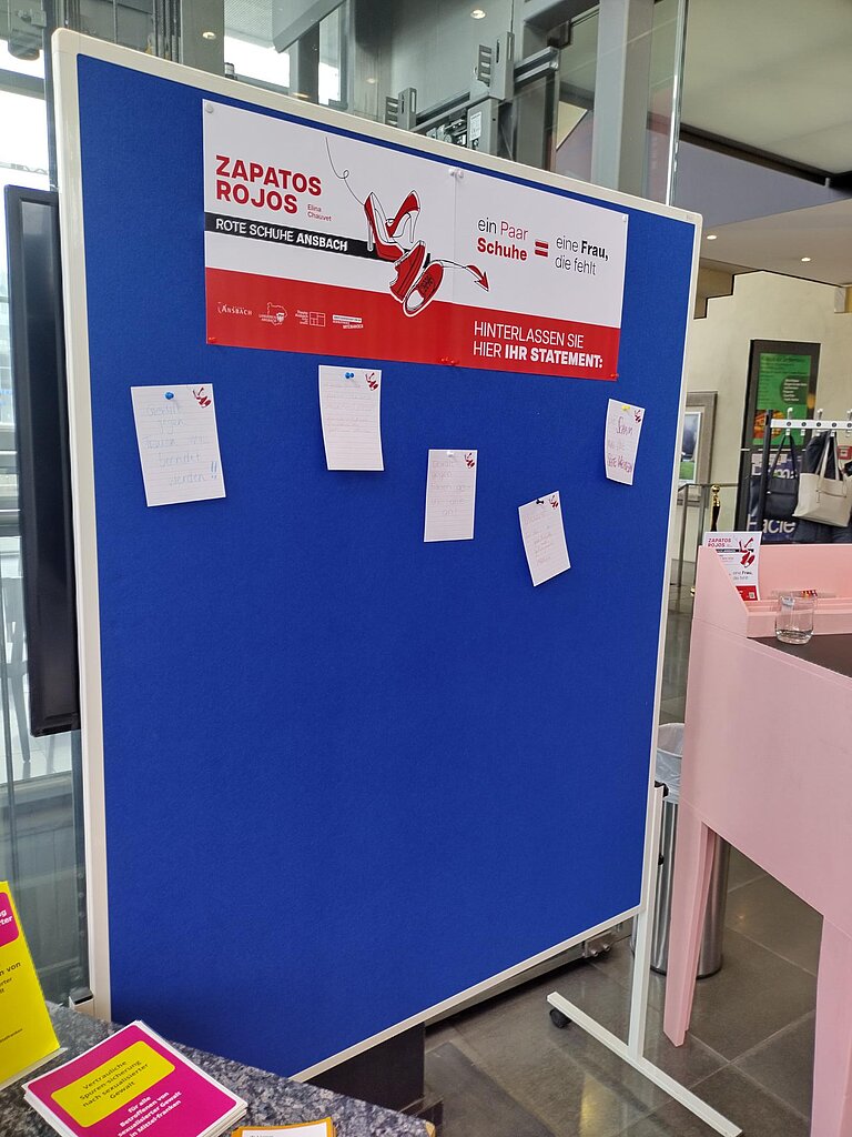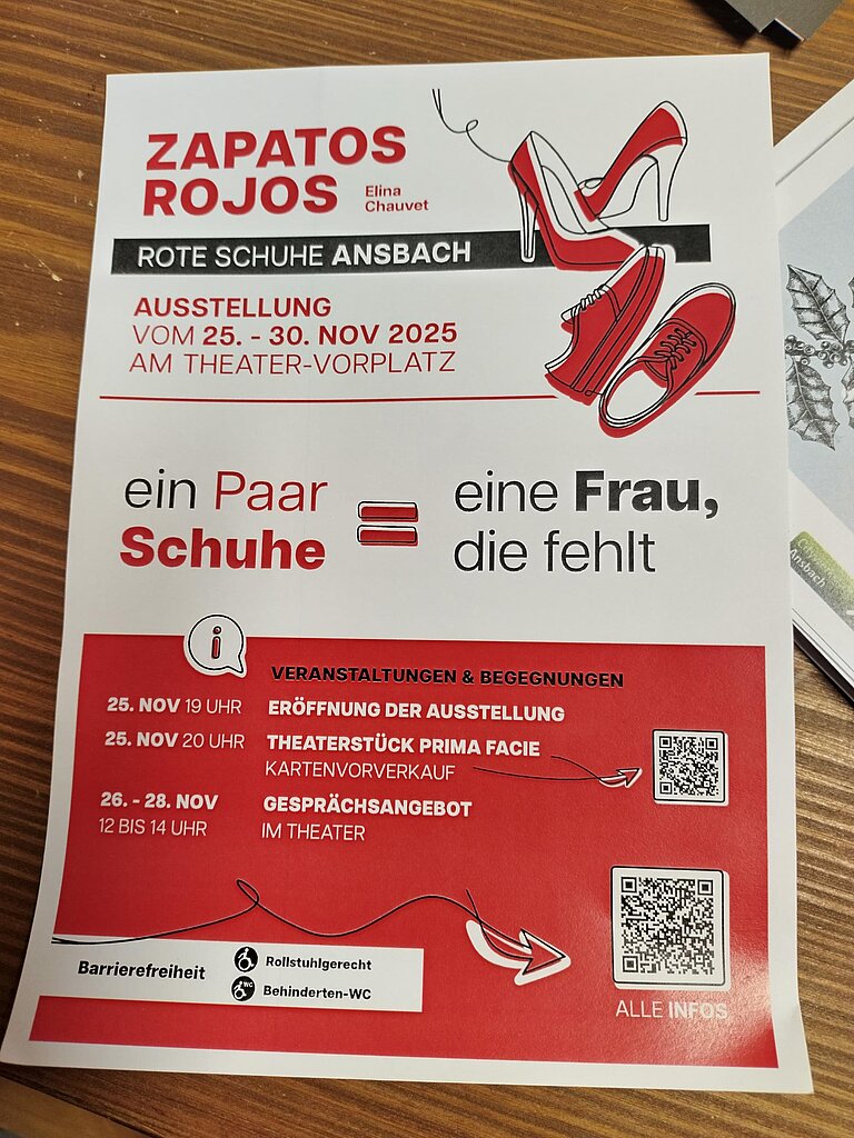 Anlässlich des Internationalen Tags zur Beseitigung von Gewalt gegen Frauen am Dienstag, 25. November 2025, wurde an diesem Tag in Ansbach die Ausstellung „Zapatos Rojos“ erfolgreich eröffnet. Sie zeigt 132 Paar Schuhe und erinnert an die 132 Frauen, die 2024 in Deutschland von ihren Partnern oder Ex-Partnern getötet wurden.