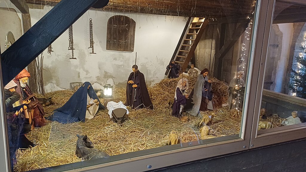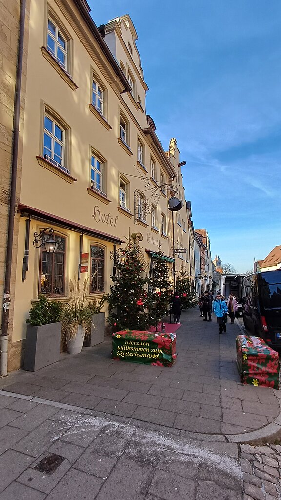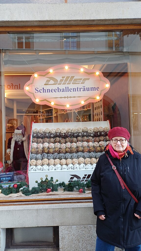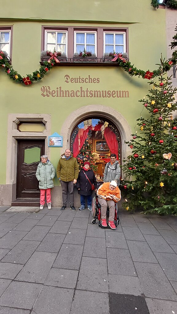Im Anschluss begaben sich die Bewohner:innen und Begleitpersonen auf einen gemeinsamen Rundgang über den Reiterlesmarkt, der sich malerisch durch die Altstadtgassen zog. An rund 60 Verkaufsständen gab es Weihnachtsschmuck, Kunsthandwerk, Kerzen, traditionelle Spezialitäten sowie die für Rothenburg typischen Schneeballen zu entdecken. Viele nutzten die Gelegenheit, kleine Geschenke oder Erinnerungsstücke zu erwerben und mit den Standbetreibenden ins Gespräch zu kommen. Immer wieder wurden kurze Pausen eingelegt, um die dekorierten Stände oder die verschiedenen Darstellungen rund um Krippen und Lichtmotive zu betrachten.