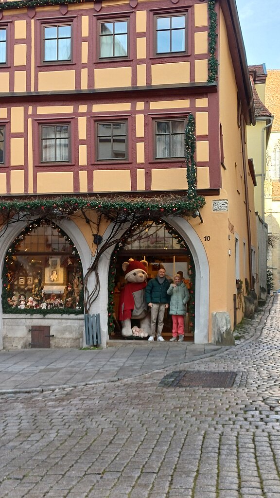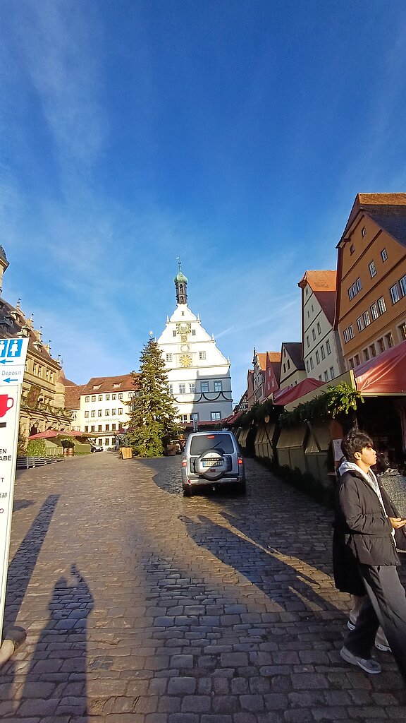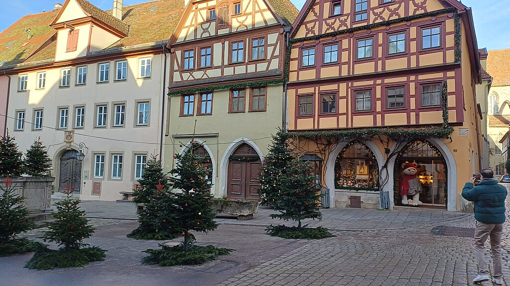 Am Vormittag startete die Reise mit dem Bus in Richtung Rothenburg ob der Tauber. Bereits unterwegs war die Vorfreude auf den gemeinsamen Weihnachtsmarktausflug spürbar. Nach der Ankunft führte ein kurzer Weg durch die historische Stadtmauer und über das Kopfsteinpflaster direkt in das Zentrum der Altstadt. Dort erwartete die Gruppe ein eindrucksvoller Anblick: Ein großer, geschmückter Weihnachtsbaum vor dem Rathaus und zahlreiche Lichterdekorationen sorgten sofort für eine festliche Atmosphäre.