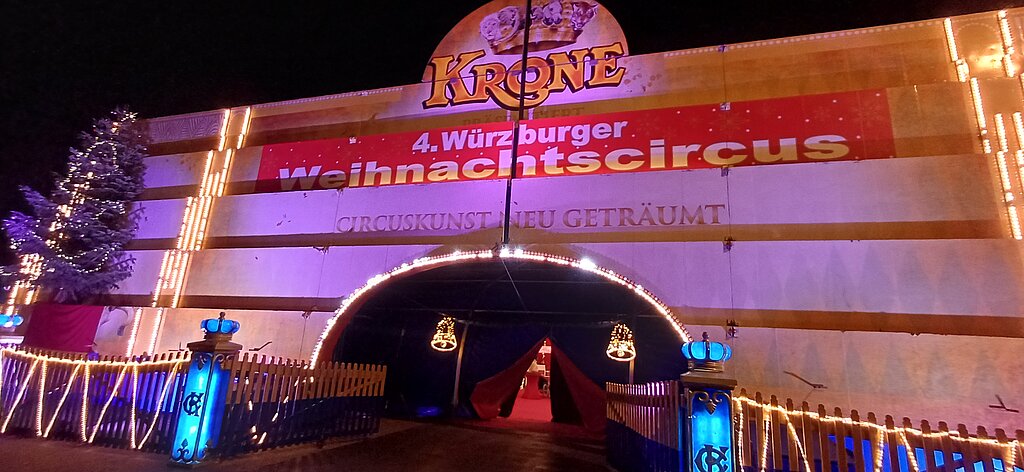 Zwei Bewohner:innen der Arche am Margeritenweg besuchten am 18. Dezember 2025 eine Vorstellung des 4. Würzburger Weihnachtscircus. Gemeinsam mit begleitenden Mitarbeitenden machten sie sich am frühen Abend auf den Weg zum Zirkuszelt auf der Talavera. Bereits bei der Ankunft sorgten der festlich beleuchtete Platz und die weihnachtliche Stimmung für große Vorfreude.