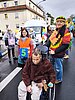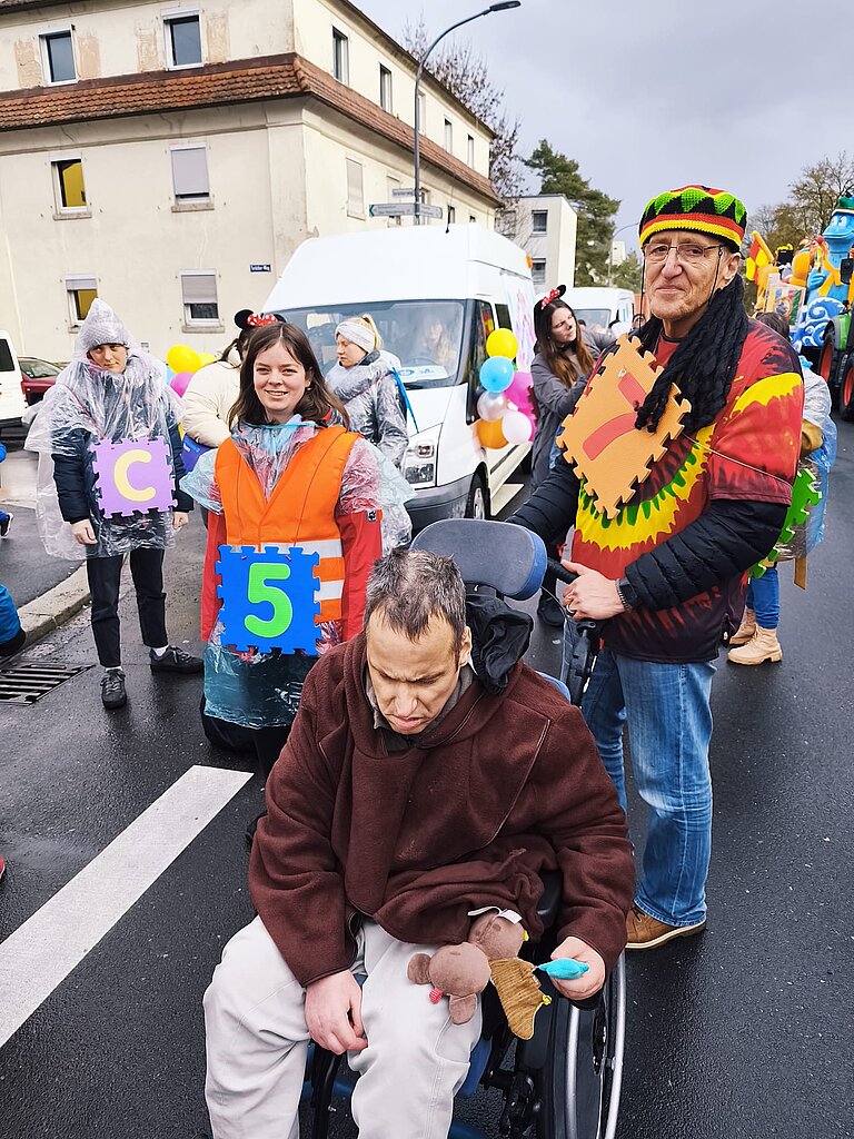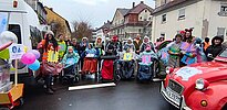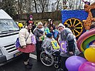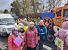 Vor den beiden bunt geschmückten Busse - abgesichert durch unsere Hausmeister, Mitarbeitenden aus den verschiedensten Bereichen und Freiwillige, rollte die bunte Rollstuhlgruppe mit ihren farbigen Puzzleteilen und kräftigen Helau-Rufen durchs Städtle.