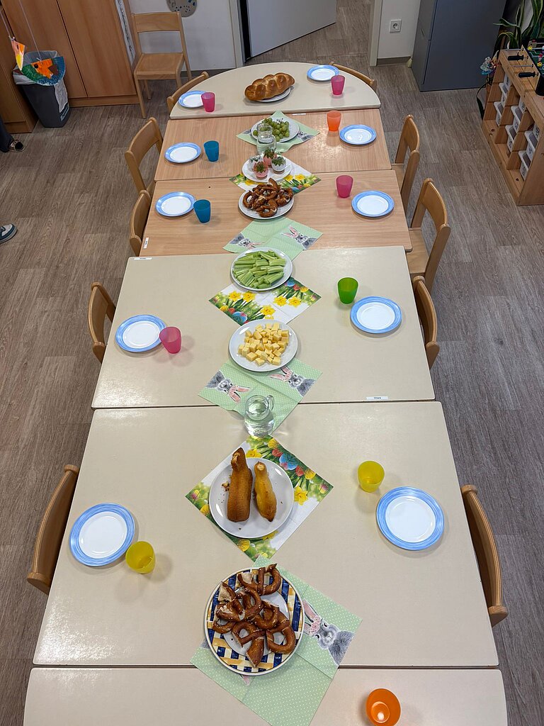 Ein besonderes Highlight war das gemeinsame Osterfrühstück. Die festlich gedeckten Tische mit leckeren Brezen, frischem Obst und kleinen Köstlichkeiten sorgten für eine gemütliche und gemeinschaftliche Atmosphäre. Auch die Kinder unserer Hortgruppe leisteten einen tollen Beitrag: Gemeinsam mit unserer Kollegin gestalteten sie bunte Ostereier, die das Frühstück liebevoll schmückten.