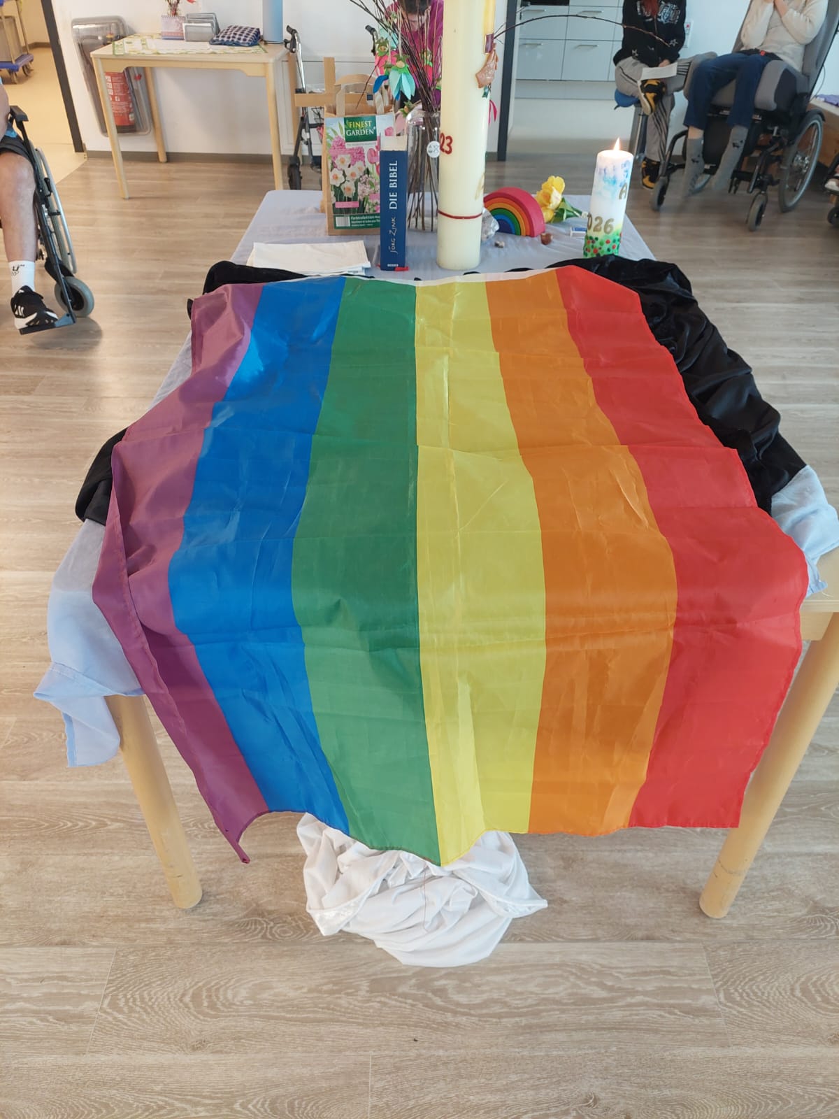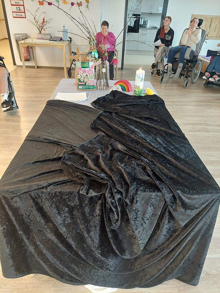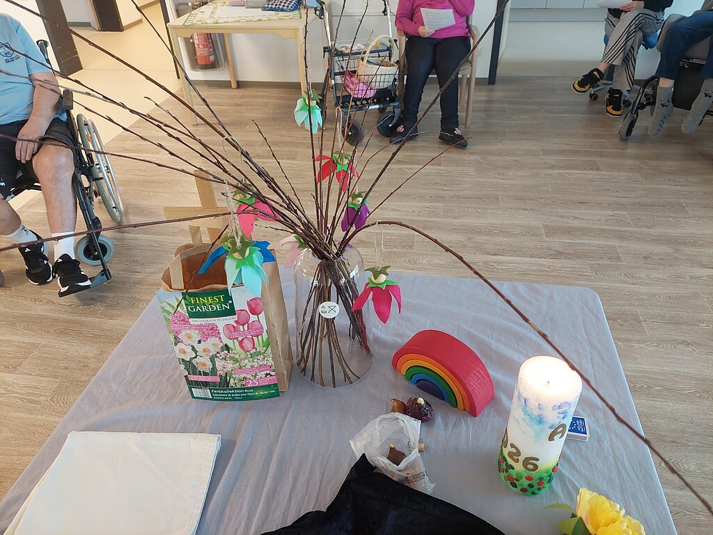 Er war mit seiner Idee eines kleinen Rollenspiels kreativ, um die Ostergeschichte den Bewohner:innen näher zu bringen. Die Fürbitten für mehr Frieden auf der Welt, vorgelesen von vier Bewohner:innen rundeten den Gottesdienst ab.