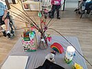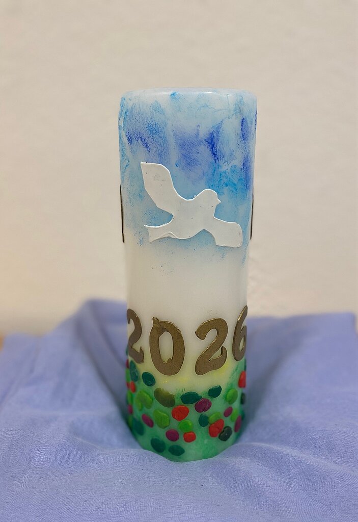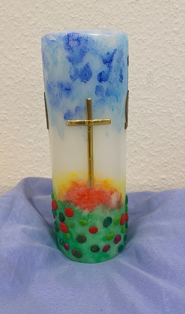 Fehlen durfte wie jedes Mal das Abschlusslied „Laudato si“ natürlich nicht. Ebenso begleitete uns unsere Osterkerze. Diese haben die Bewohner:innen in einem Projekt mit der Kirchengemeinde der Gethsemane Kirche am Heuchelhof mit Frau Deborah Drexel in der Vorosterzeit gestaltet.