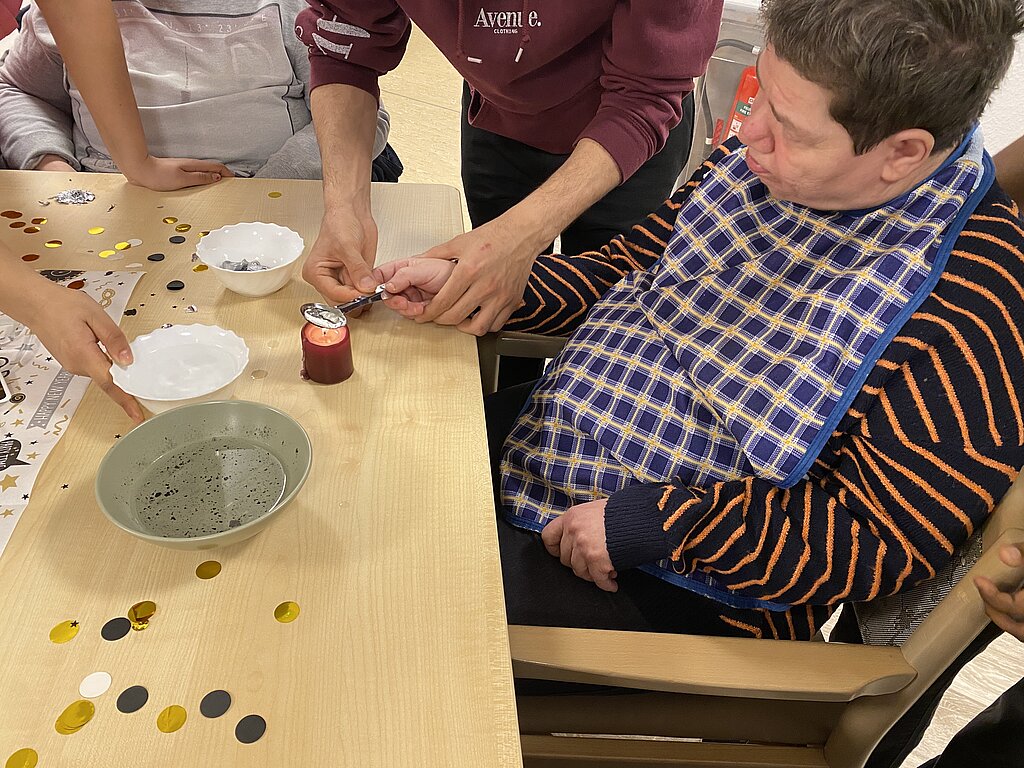 Die Leckereien wurden am Morgen gemeinsam von der Kochgruppe und den Bewohner:innen zubereitet. Den Start in den Abend machte das gemeinsame Bleigießen im Erdgeschoss – für alle ein amüsanter Moment voller Spannung und Lachen.